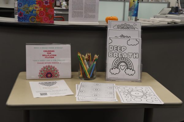 A colorful display of free coloring pages in the library offers students a creative way to decompress and unwind during the demanding midterm week. (Veronica Minogue)