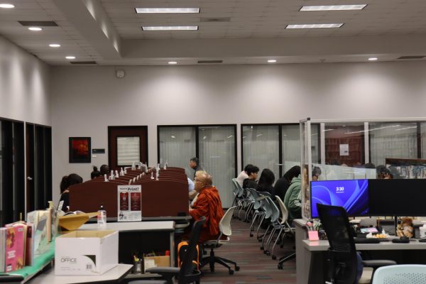 Every seat in the library is occupied as students read, research, seek quiet corners to relax, or take advantage of campus resources during the peak of midterm season. (Veronica Minogue)