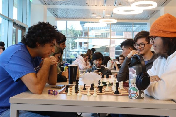 Camilo Maciel, 21, (left) faces off against friend Ivan Avalos, 21, in a focused game of chess during a break between classes, using strategy to take a mental breather from midterm stress. (Veronica Minogue)
