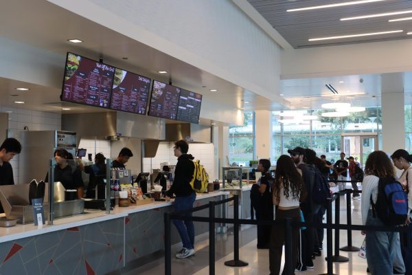 Students line up at the Mt. SAC Cafe during a busy lunch rush, grabbing a quick bite before setting off in search of a quiet spot to eat and squeeze in some last-minute studying before their next class. (Veronica Minogue)