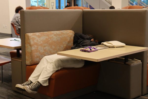 A student takes a quick nap in the Student Center, recharging after a long day of lectures and midterm preparation. (Veronica Minogue)