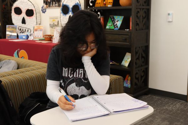 Biology major Alexandra Juarez, 18, studies terminology for her first-ever biology midterm, tucked away in a quiet corner of the El Centro Building. (Veronica Minogue)